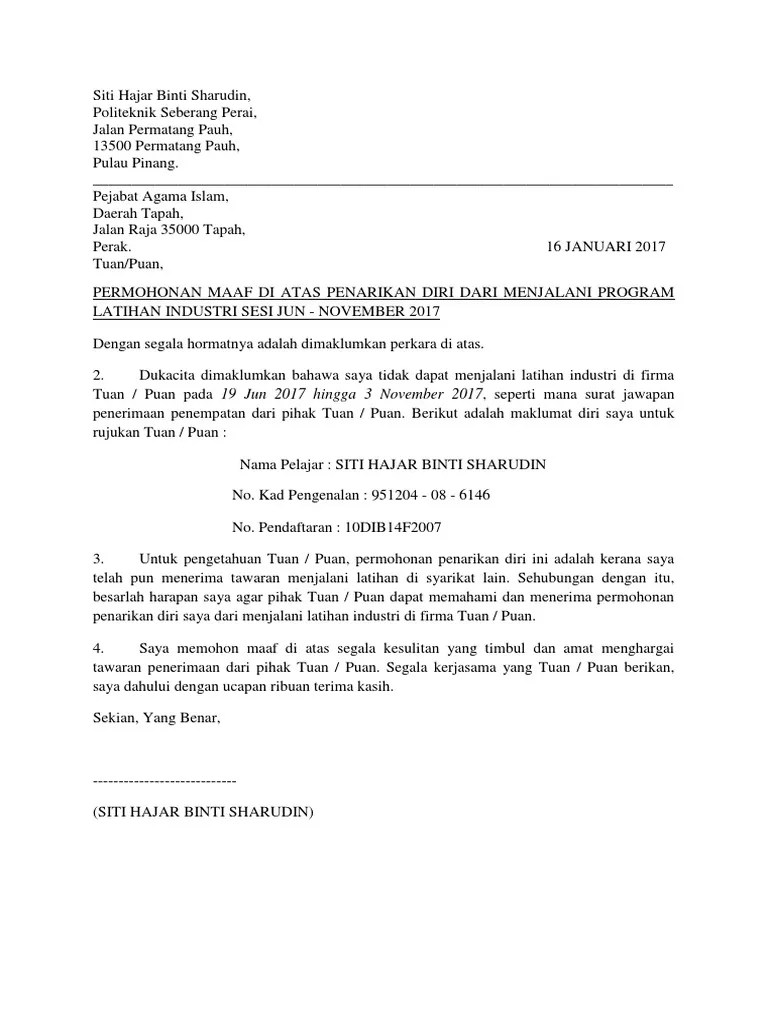 Surat mohon maaf menolak tawaran latihan industri. Sila kembalikan ke politeknik sultan haji. Surat tarik diri dari firma latihan .